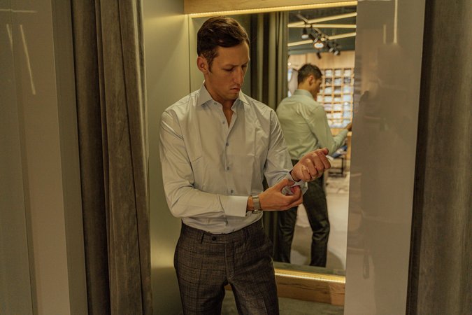- 셔츠 고르기: 체형에 맞는 더블 커프 옥스포드 셔츠를 선택하세요. 꼭 손목 길이를 체크! ⏰